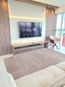 - Sala de TV com Netflix, TV a cabo e internet, sofá retrátil que se transforma em cama de casal e vista para o mar.
