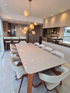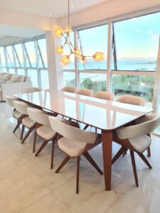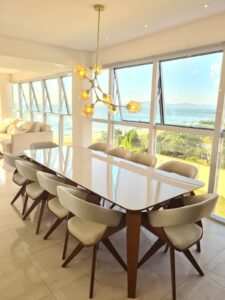 - Sala de jantar com mesa para 10 lugares, balcão auxiliar com 3 banquetas e vista deslumbrante para o mar. Ar-condicionado.