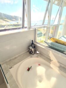 - 4 suítes espaçosas (incluindo 1 master com banheira), todas com ar-condicionado e vista para o mar.